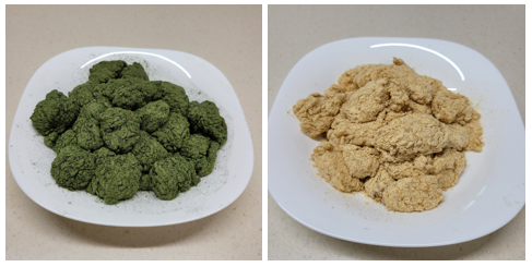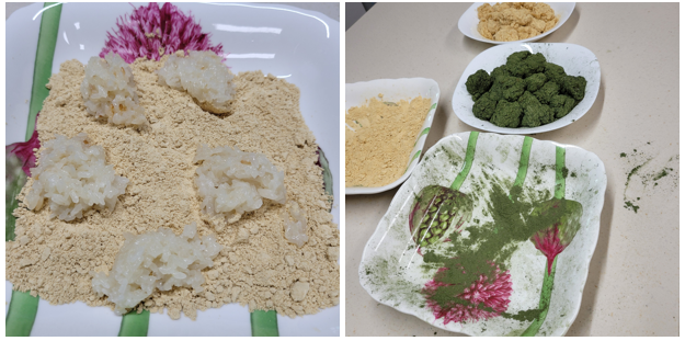 다지은 찹쌀밥을 적당히 짓이겨 놓고 조금씩 떼서 쑥가루와 콩가루를 묻혔다.